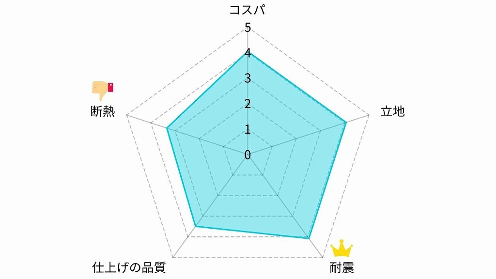 実際に住んでいる100人の人たちは、コスパ(★4.04)、立地(★4.06)、耐震(★4.08)に高評価を付けました。一方で、壁紙など仕上げの品質(★3.49)、断熱(★3.34)には低めの点数を付けています。
