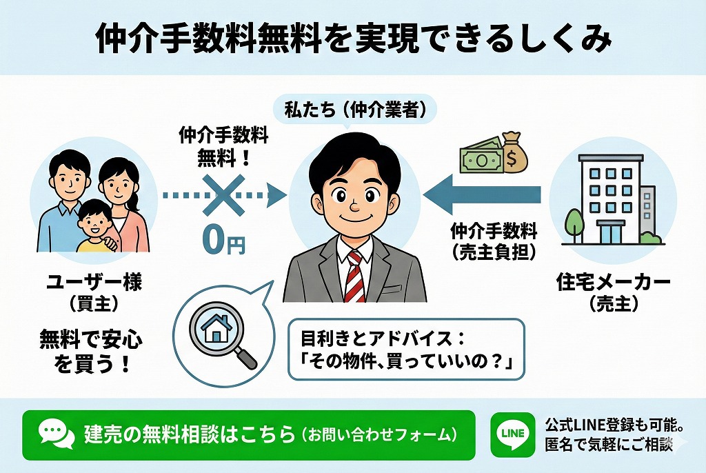 手数料無料を実現できるのは「仲介料売主負担」というルール。住宅メーカーからのみ仲介手数料を受領するので、ユーザー様は無料で利用いただけます。
