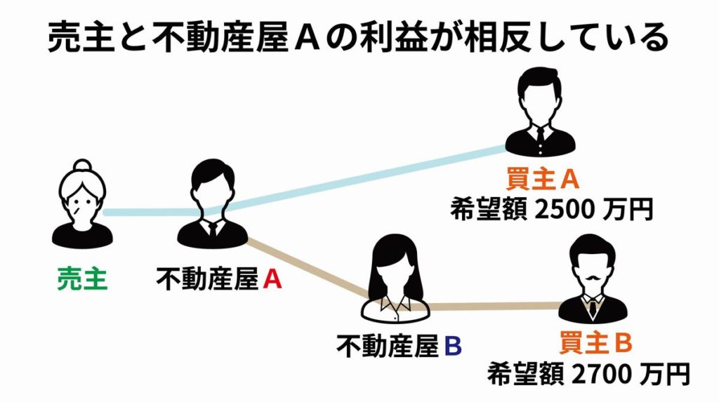 上の図を見ればわかるように、不動産会社と売主の利益が相反することがあります。