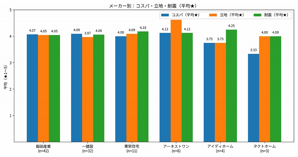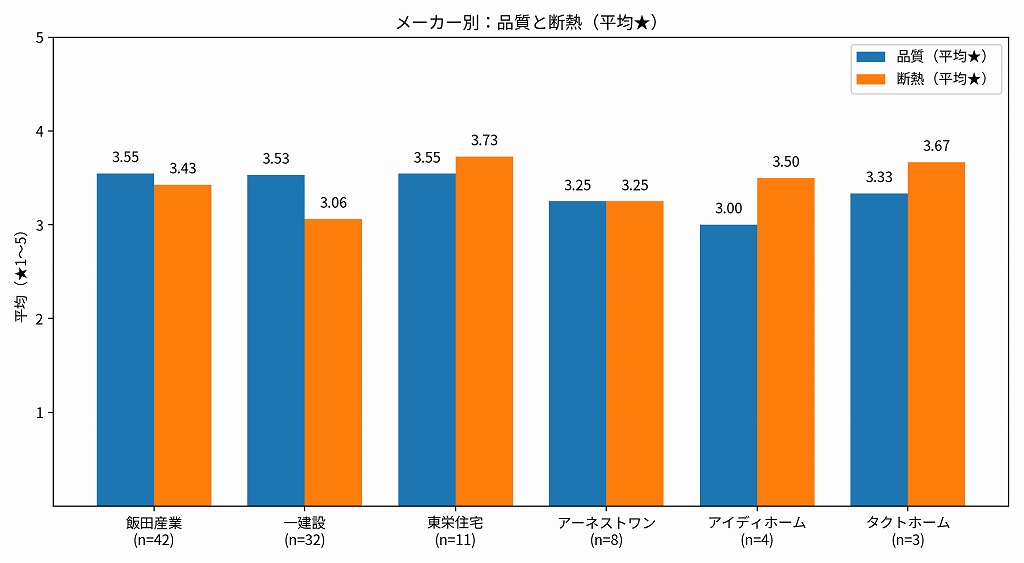 メーカー別で見ると断熱は一建設が低め、東栄住宅が相対的に良好という傾向があります。