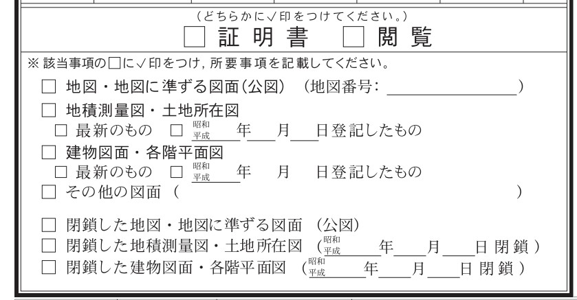 上図の「□証明書」をチェックし、「□地図・地図に準ずる書面(公図)」にチェックを入れて提出してください。公図が見つかったら(ごくまれに存在しない場所もあります)、窓口の人が料金を教えてくれるので、その金額の印紙を貼って提出します。